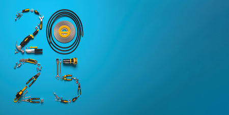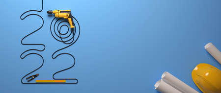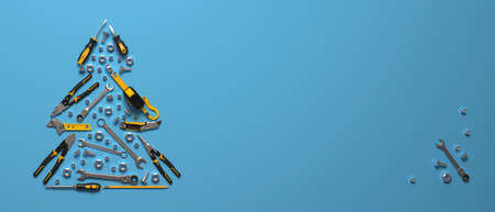 Flying view of yellow construction tools for repair and installation on blue background. 3d rendering and illustration of service banner for house plumber or repairman