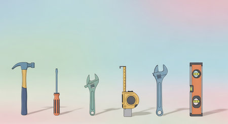Essential home repair tools including wrench, tape measure, nails, and screwdriver for simple maintenance and diy projects, white background, copy space.