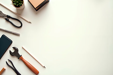 Flat lay workspace with tools, stationery, and a smartphone