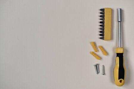 minimalistic flat lay with a screwdriver and a pliers. background with empty space for text