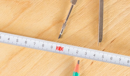 Tools for drawing and measuring on a wooden background