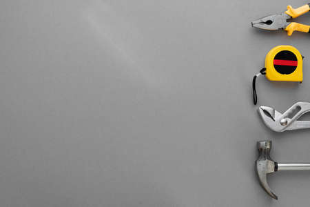 Flat lay composition with construction and home repair tools tools on gray background, space for text
