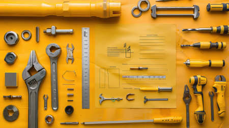A vibrant yellow background showcases a variety of tools and equipment, ideal for showcasing craftsmanship and repair. Perfect for DIY themes.