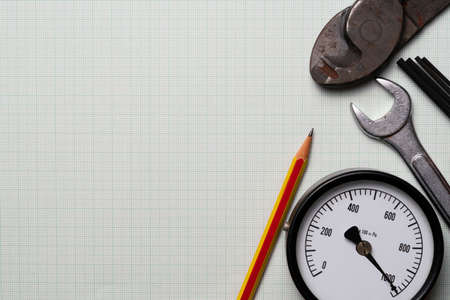Old tools equipment with paper graph table background, engineering concept