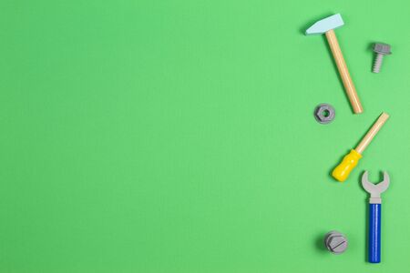 Wooden kids toys screwdriver, plier, bolts, nuts and other construction tools frame on light green background