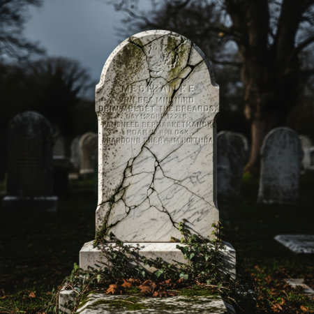 Somber cemetery scene wilted flowers on gravestone under overcast sky evoking quiet mourning
