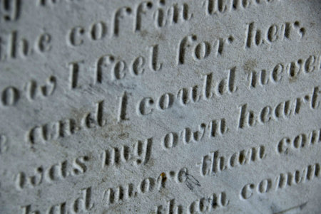 Closeup on Tomb stone with inscription Sacred In the Memory Of