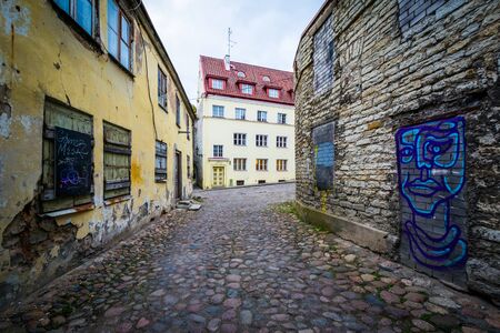 Graffiti along a narrow cobblestone street, in the Old Town of Tallinn, Estonia.