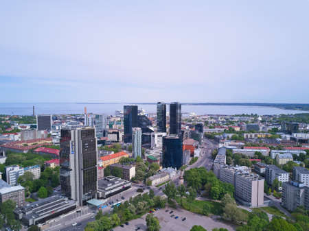 TALLINN, ESTONIA - MAY, 2018 Aerial cityscape of modern business financial district with tall skyscraper buildings