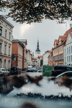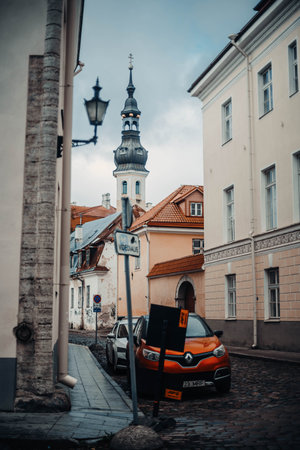 Church spire over colourful old town street in Tallinn, Estonia
