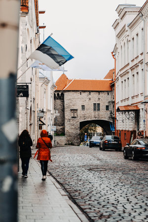 Woman in red coat walking under Estonia flag in the old town in Tallinn, Estonia
