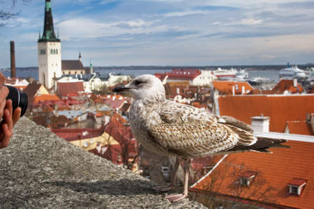 White gull standing in front of the old town of Tallinn in Estonia