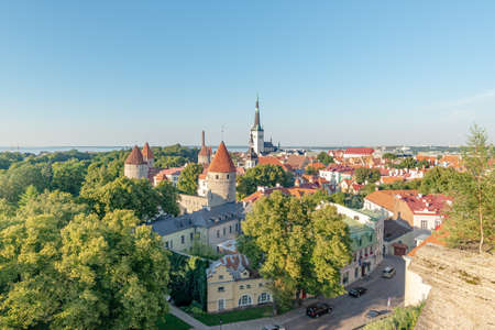 Iconic aerial skyline view of Tallinn Old Town on a sunny summer morning. St. Olaf's, St. Michael's churches, Alexander Nevsky Cathedral, defensive walls, rooftops. UNESCO World Heritage site, Estonia