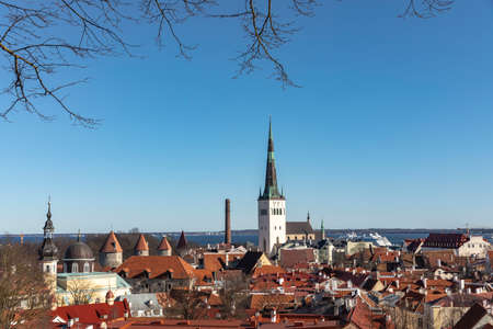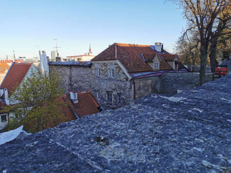 View of the old city in Tallinn near the Kohtuotsa viewing platform. Sunny spring day in Estonia 2021
