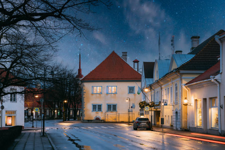 Kuressaare, Estonia. Building Of Noble Assembly And Kuressaare Town Hall At Lossi Street In Evening Or Night Illuminations