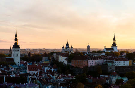Skyline of Tallinn Old Town at sunset. View from above