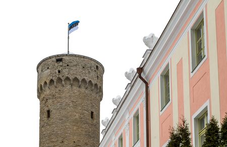 Herman Tower and Parliament building (left) in center of Tallinn, Estonia