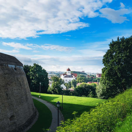 Prechistensky Cathedral, Orthodox Church in Old Town of Vilnius, Lithuania. Panoramic summer cityscape urban view from hill of Artillery Bastion with blue cloudy sky and green trees