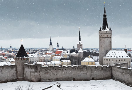 Snow-covered view of the medieval city walls of Tallinn, Estonia, under a low-hanging winter sky