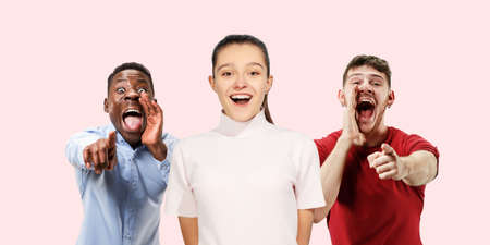 Group portrait of emotional people on coral pink studio background. Flyer, collage made of 5 models. Concept of human emotions, facial expression, sales, ad. Embarrassed smiling, pointing, shouting.