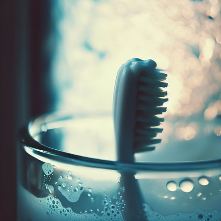 Toothbrush toothpaste bath glass closeup morning.