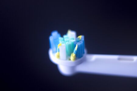 Toothbrush closeup on a blue background. Macro with shallow depth of field.