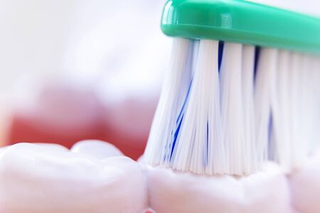 Macro photo of toothbrush that is rubbing teeth, showing on a jaw model how to clean the teeth with tooth brush properly
