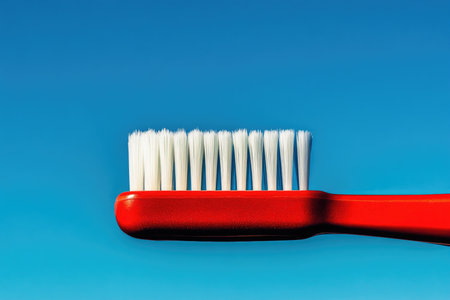Close-Up of Red Toothbrush with White Bristles Against Clear Blue Sky Background.