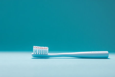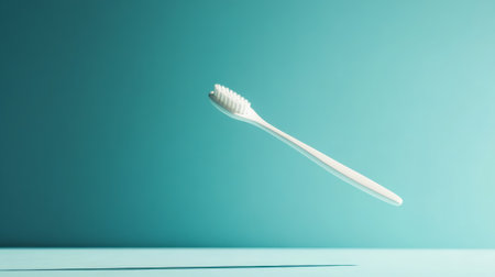 Single white toothbrush floats in the air against a vibrant turquoise backdrop, symbolizing good oral hygiene practices and the importance of dental care