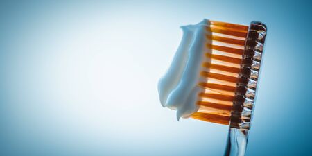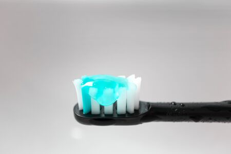 Toothpaste on the tooth cheek. Toothpaste squeezed onto a toothbrush, Healthy lifestyle concept. Copy space.