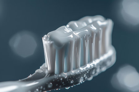 Extreme close-up of a toothbrush with white toothpaste, highlighting the bristles and the smooth texture of the toothpaste.