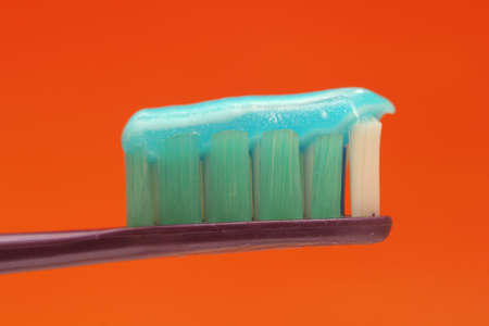 Macro of a toothbrush with toothpaste against orange background