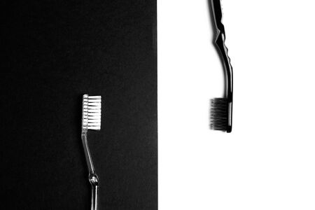 Black and white toothbrushes on a black and white background. Flat lay, top view, copy space. Black and white image.