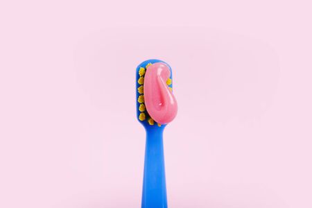 Bright toothbrush with pink paste close-up on a pink background.