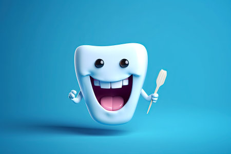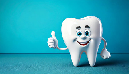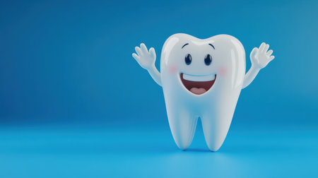 This cheerful cartoon tooth character stands against a blue background, radiating joy and positivity. Perfect for promoting dental health and hygiene.