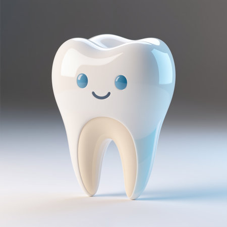 A cartoon tooth with a smiling face, blue eyes, and a shiny surface, symbolizing good oral health and hygiene, against a gray and white gradient background.
