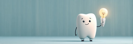 A cheerful cartoon tooth character stands confidently, holding a tiny dental implant, showing a playful vibe in a simple and friendly setting.
