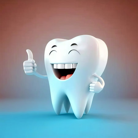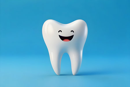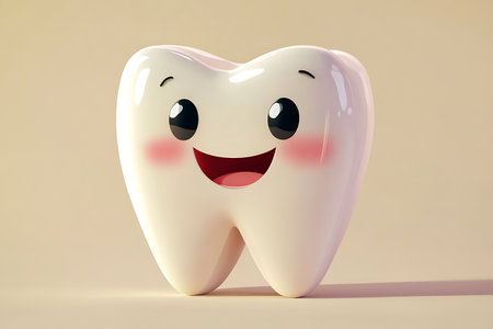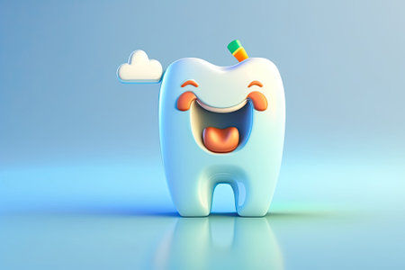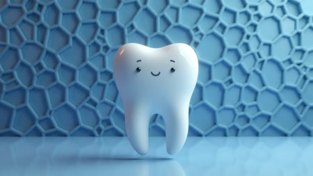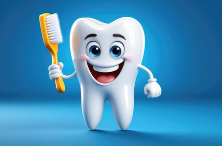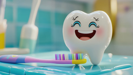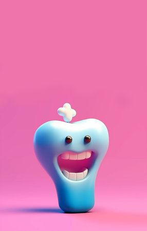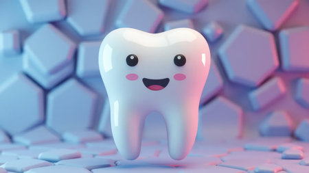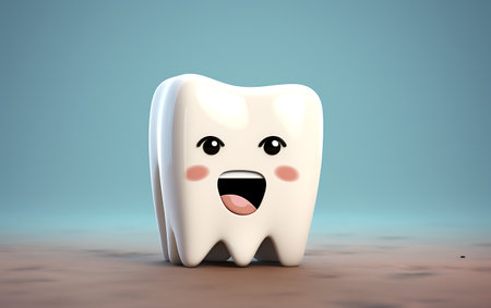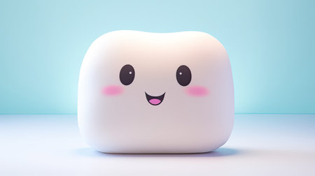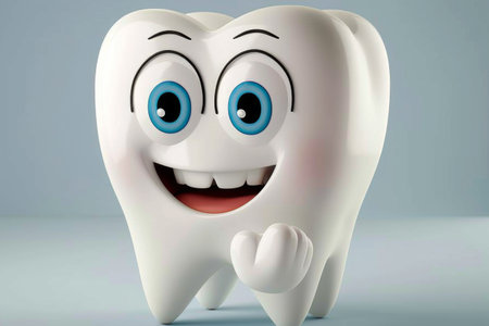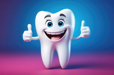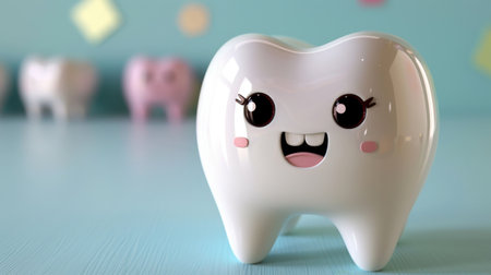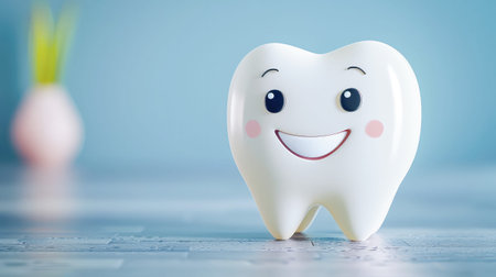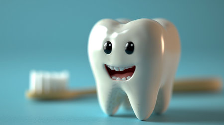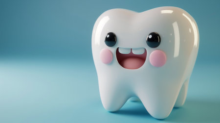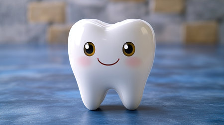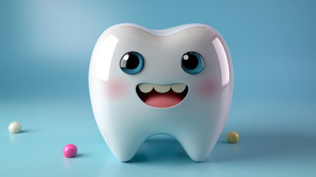 A cheerful cartoon tooth character with large blue eyes and a bright smile exudes positivity and promotes dental health. Its playful demeanor encourages good oral hygiene habits among children.
