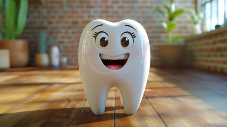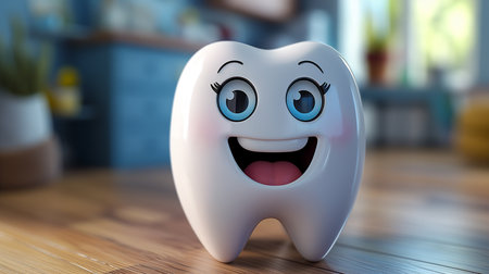 A playful tooth icon with a smile sits on a wooden table, representing dental health and care in a bright environment.