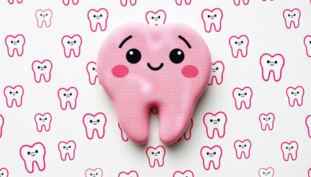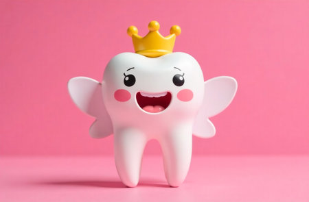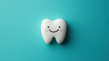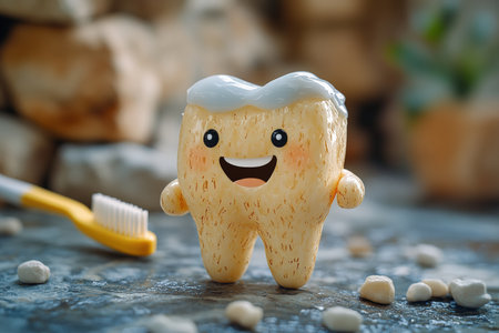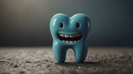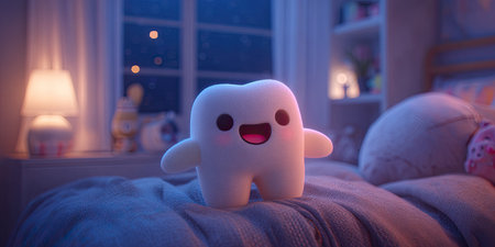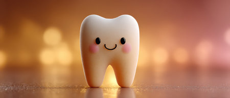A cheerful tooth figurine with a smile sits on a shiny surface creating a warm and playful atmosphere with soft lighting.