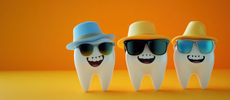 Playful Tooth Characters in Sunglasses on a Bright Background. Space for Text. High quality photo