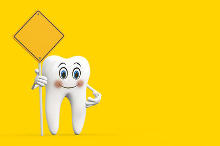 White Tooth Person Character Mascot and Yellow Road Sign with Free Space for Yours Design on a yellow background. 3d rendering