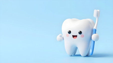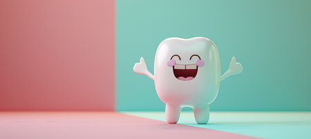 Adorable cartoon tooth character on pastel background with copy space for text placement