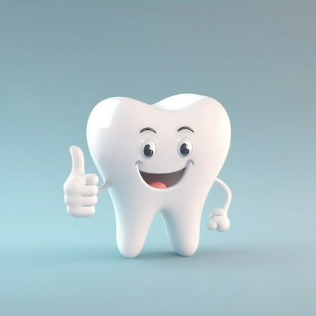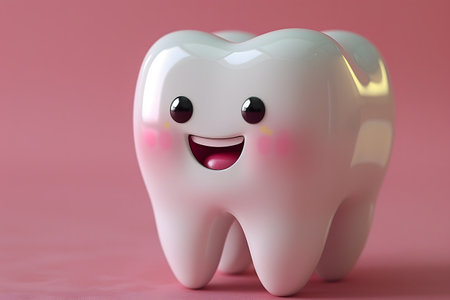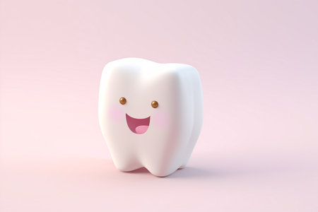 A cute tooth character with rosy cheeks and arms waving happily, promoting dental care in a fun way.