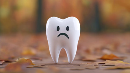 scared tooth stands alone on wooden surface surrounded by autumn leaves, evoking sense of worry and concern. This whimsical image captures playful essence of dental health awareness.