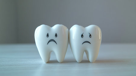 A pair of toy teeth with sad expressions, reflecting dental problems like cavities, against a simple, clean background