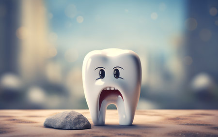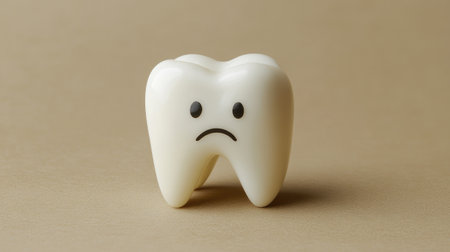 Toy teeth with a sad, upset face, symbolizing the pain of cavities and tooth decay, placed on a neutral background