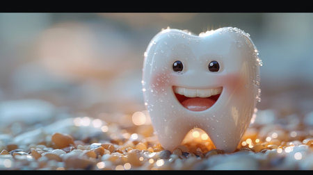 Smiling Cartoon Tooth Character on Sparkling Pebble Beach at Sunset