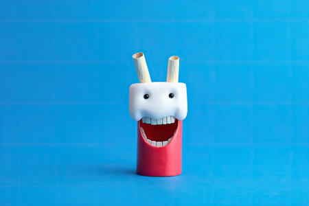 Toy teeth with a frowning face, highlighting the concept of dental health issues and cavities, on a light-colored backdrop