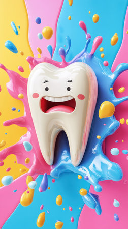 Cheerful tooth character is playfully depicted amidst a vibrant paint splash, symbolizing fun and positive dental care